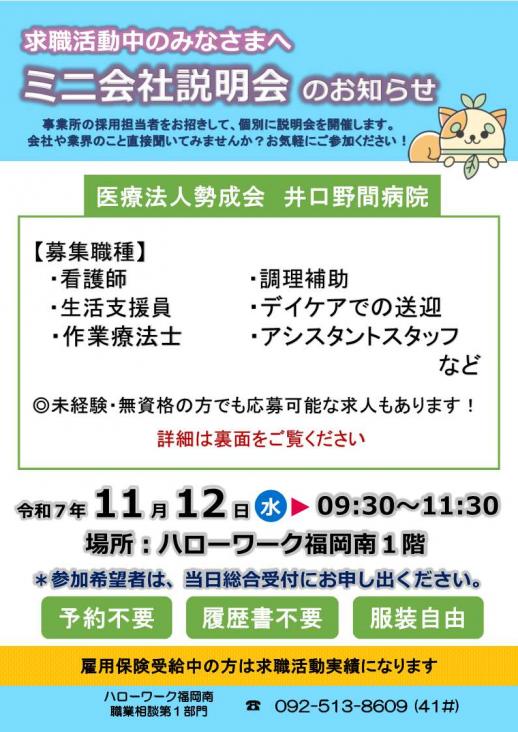 お問い合わせ先:ハローワーク福岡南 職業相談第1部門 電話番号:092-513-8609 |