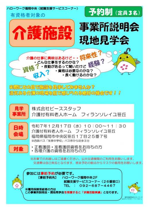 【ハローワーク】福岡県内のハローワークでは、人材確保推進分野(医療・介護・保育・建設・警備・運輸)の就職支援に関する業界セミナーや会社説明会、面談会、見学会など各種イベントを随時開催しています。