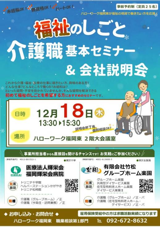 【ハローワーク】福岡県内のハローワークでは、人材確保推進分野(医療・介護・保育・建設・警備・運輸)の就職支援に関する業界セミナーや会社説明会、面談会、見学会など各種イベントを随時開催しています。