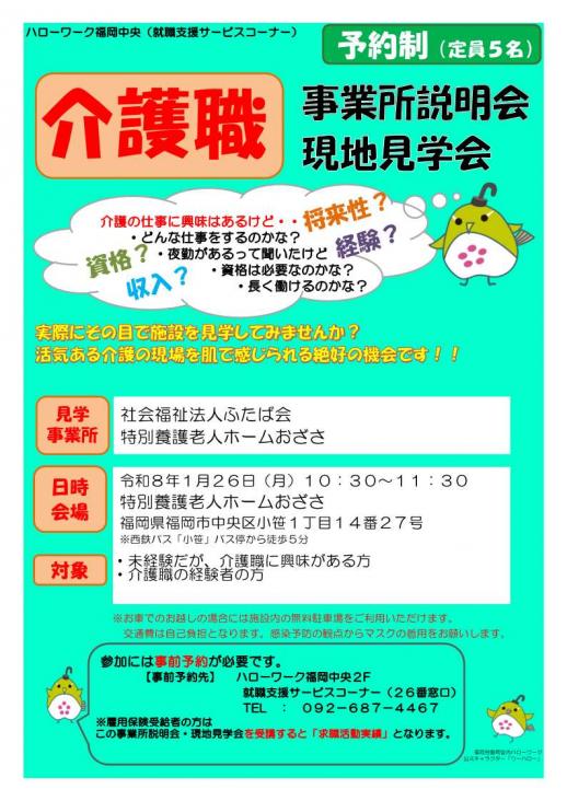 【ハローワーク】福岡県内のハローワークでは、人材確保推進分野(医療・介護・保育・建設・警備・運輸)の就職支援に関する業界セミナーや会社説明会、面談会、見学会など各種イベントを随時開催しています。