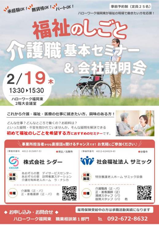 【ハローワーク】福岡県内のハローワークでは、人材確保推進分野(医療・介護・保育・建設・警備・運輸)の就職支援に関する業界セミナーや会社説明会、面談会、見学会など各種イベントを随時開催しています。