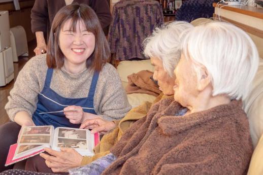 入居者の中に、糖尿病を患った方で、認知症が進行して表情が乏しくなった方がいました。甘いものが好きだったのですが食事制限があり、なかなか自由に食べることができません。ある日、その入居者の方がみかんを食べた際、とてもにこやかにおいしそうな表情をされたので、写真に撮り、ご家族に送りました。その後、ご家族から「こんな笑顔を久しぶりに見れた。とてもよかった」とお礼をいただきました。ご家族は、面会の度に表情が少なくなっていくのを心配していたようで、少しほっとした様子でした。私たちの仕事は、直接接する入居者の方だけでなく、そのご家族も笑顔にできる仕事だと認識した出来事でした。